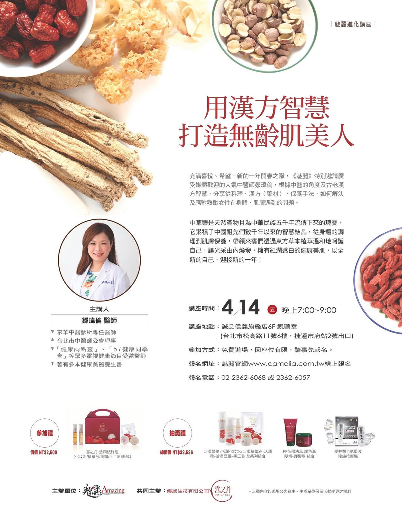 中草藥是天然產物且為中華民族五千年流傳下來的瑰寶,它累積了中國祖先們數千年以來的智慧結晶,從身體的調理到肌膚保養,帶領來賓們透過東方草本植萃溫和地呵護自己,讓光采由內煥發,擁有紅潤透白的健康美肌,以全新的自己,迎接新的一年!