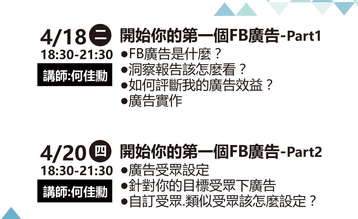 你是不是也想在粉絲團推廣你的產品?在網路上賣東西,就如同在現實世界開店一樣,都希望有人到你的店裡,購買你的商品。至於如何讓人到你的賣場呢?最簡單的方式就是使用FB廣告。這堂課將會教你如何在FB買廣告,並發揮最大的效益。這三個小時將教大家如何從沒有人到有人,再將人脈轉成錢脈。