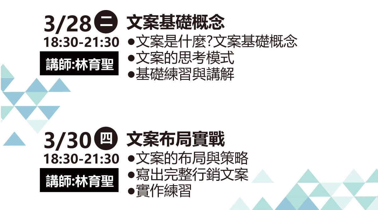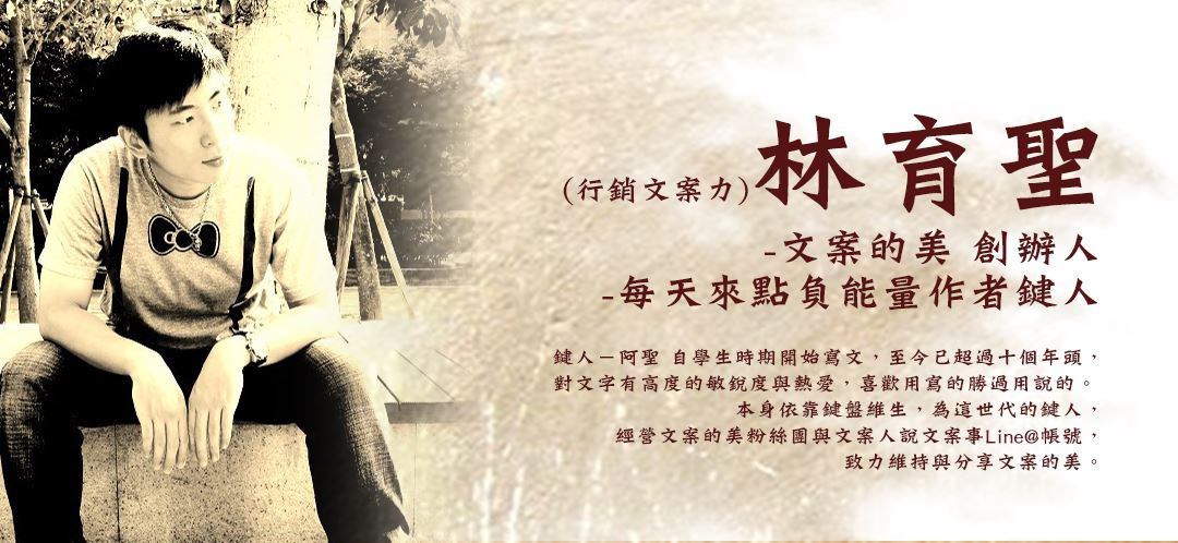 你知道什麼是文案嗎?你知道文案之於廣告的重要性嗎?文案是為了宣傳商品、企業、主張或想法,在報章雜誌、海報等平面媒體或電子媒體的圖像廣告、電視廣告等使用的文稿或以此為業的?。一般來說,文案等於廣告,如何用好的文案來吸引、貼近你的受眾,以此展現你的特色,一起來學習如何用好的文案讓消費者記得你吧!本次特別邀請到每天來點負能量的作者-林育聖,6小時為大家解構文案、一起學習用文案打動你的TA。