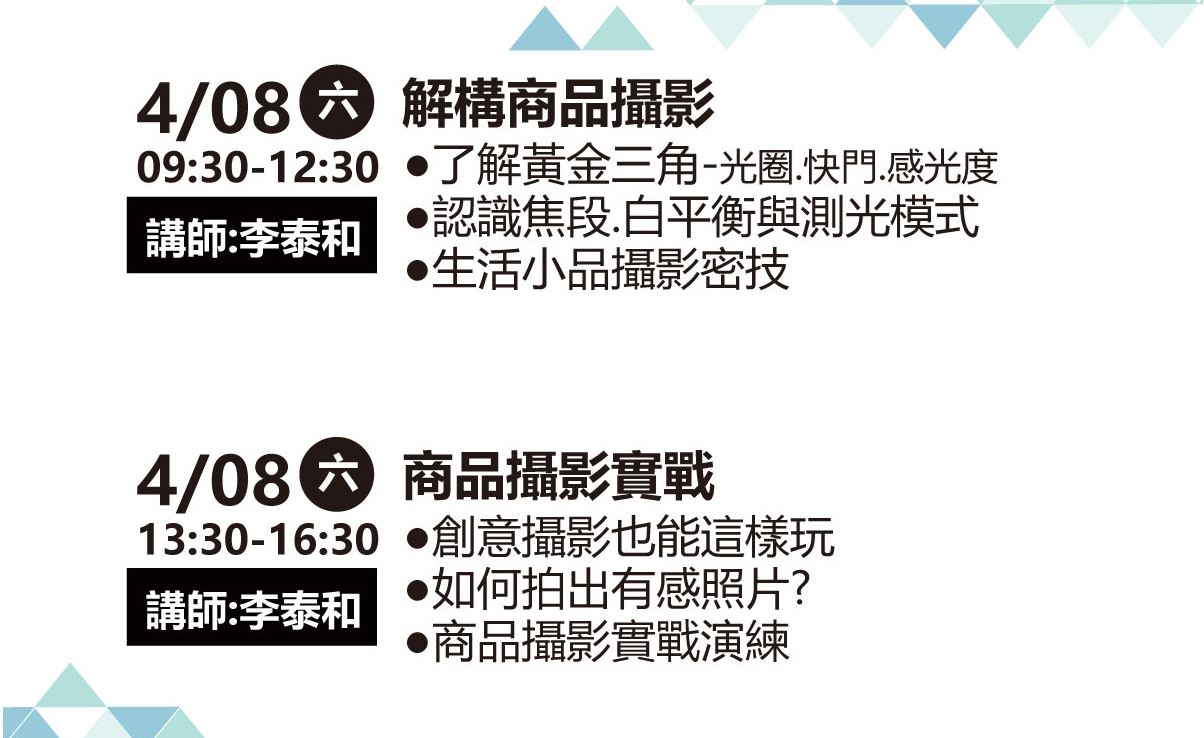 在家也能搭建攝影棚,建立小型工作室拍出照片氛圍! 了解光圈、快門與感光度的黃金三角關係!抓住那道『光』,巧妙運用柔光、硬光、逆光凸顯商品特色,讓商品照的呈現有不同質感堆疊!