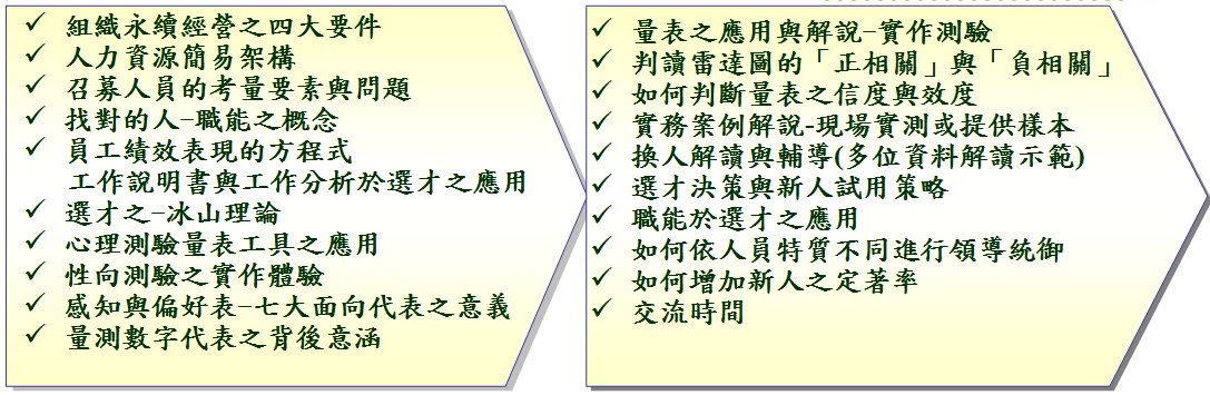 統整永續經營並保有競爭力之四大要件以「做對的事」、「找對的人」、「讓人把事做對」、最後如何「把對的人放在對的位置」,這四項就像四方桌般,一但一腳不穩,就會影響企業之營運!然而,如何招募時『找到對的人上車』,往往考驗企業在招募方法上的重大課題,因此特別規劃本議題,教導學員如何善用量測工具,本課程以實作教導為主,藉由現有量表實際體驗,如何進行人員遴選及管理、分析與運用,以提升組織績效及增加員工之工作滿意度與向心力。