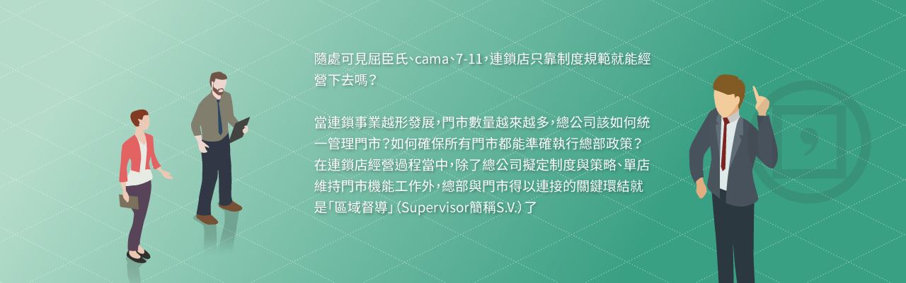 當連鎖事業越形發展,門市數量越來越多,總公司該如何統一管理門市?如何確保所有門市都能準確執行總部政策?在連鎖店經營過程當中,除了總公司擬定制度與策略、單店維持門市機能工作外,總部與門市得以連接的關鍵環結就是「區域督導」(Supervisor簡稱S.V.)了。