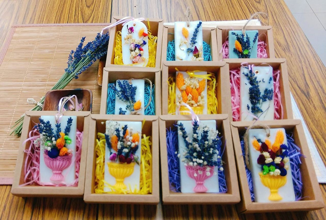 我們使用天然無毒大豆蠟及蜜蠟製作您的香氛掛片,提供充分的乾燥花及飾品,並選擇妝品級香精油讓您的掛片香味芬芳且持久,連裝蠟片的紙盒都為您準備好,上完課可以直接去送禮喔!!