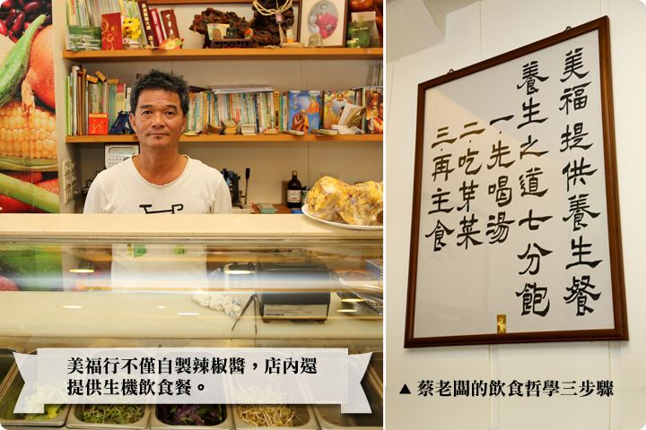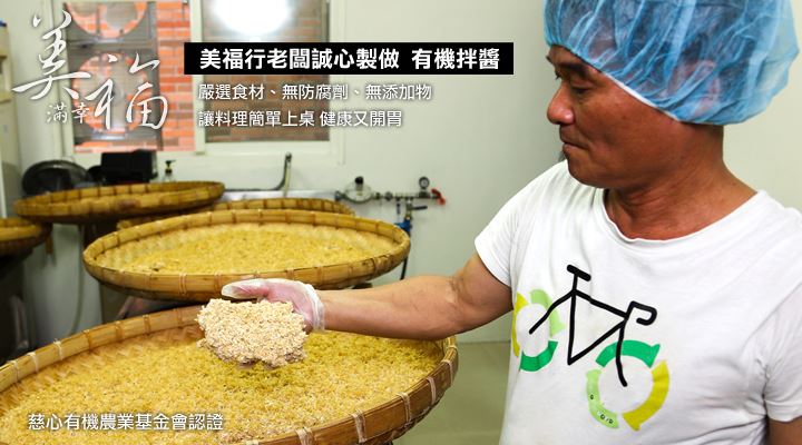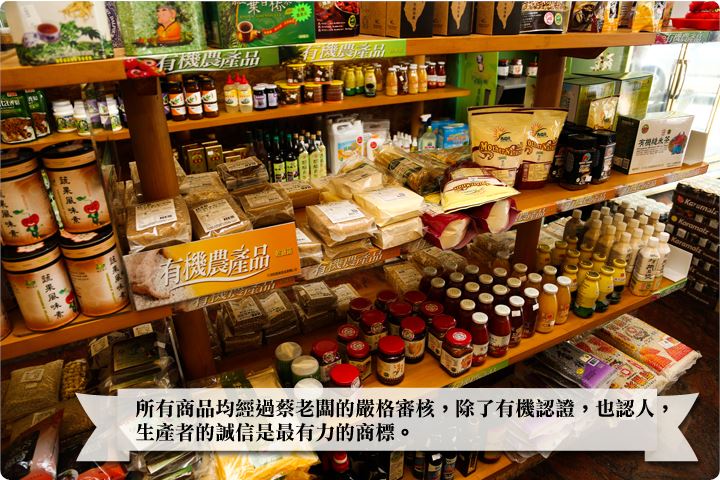 「為了農民有更好的生活,有個更好的土地,下一代可以吃到好東西」說穿了,讓蔡老闆堅持做有機的信念僅是如此。早年從事藥房工作的他,因為過度操勞,才20幾歲人已經顯出40歲的老態,遂決定回歸自然,改變生活與飲食,開始做起有機店,甚至到慈心有機認證機構擔任義工,到各地去勘查有機農場,一直到後來自己做起有機拌醬。時過境遷,現在朋友看到蔡老闆,問他怎麼好像沒老,他都笑稱自己是「老起來等,現在變卡少年款啦!」。