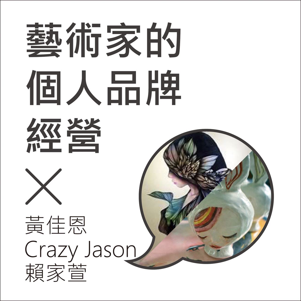 Crazy Jason(本名許殷豪)與黃佳恩皆是深根高雄許久的藝術家,兩人在創作的路上始終堅持著個人風格,但對於自我的品牌經營卻有不一樣的看法。 Jason與佳恩分別在藝起基金會舉辦的《宅沙龍》講座各自講述過他們的經驗,這次在《不貧窮藝術節》更是直接邀請兩人對談個人品牌經營的心得。