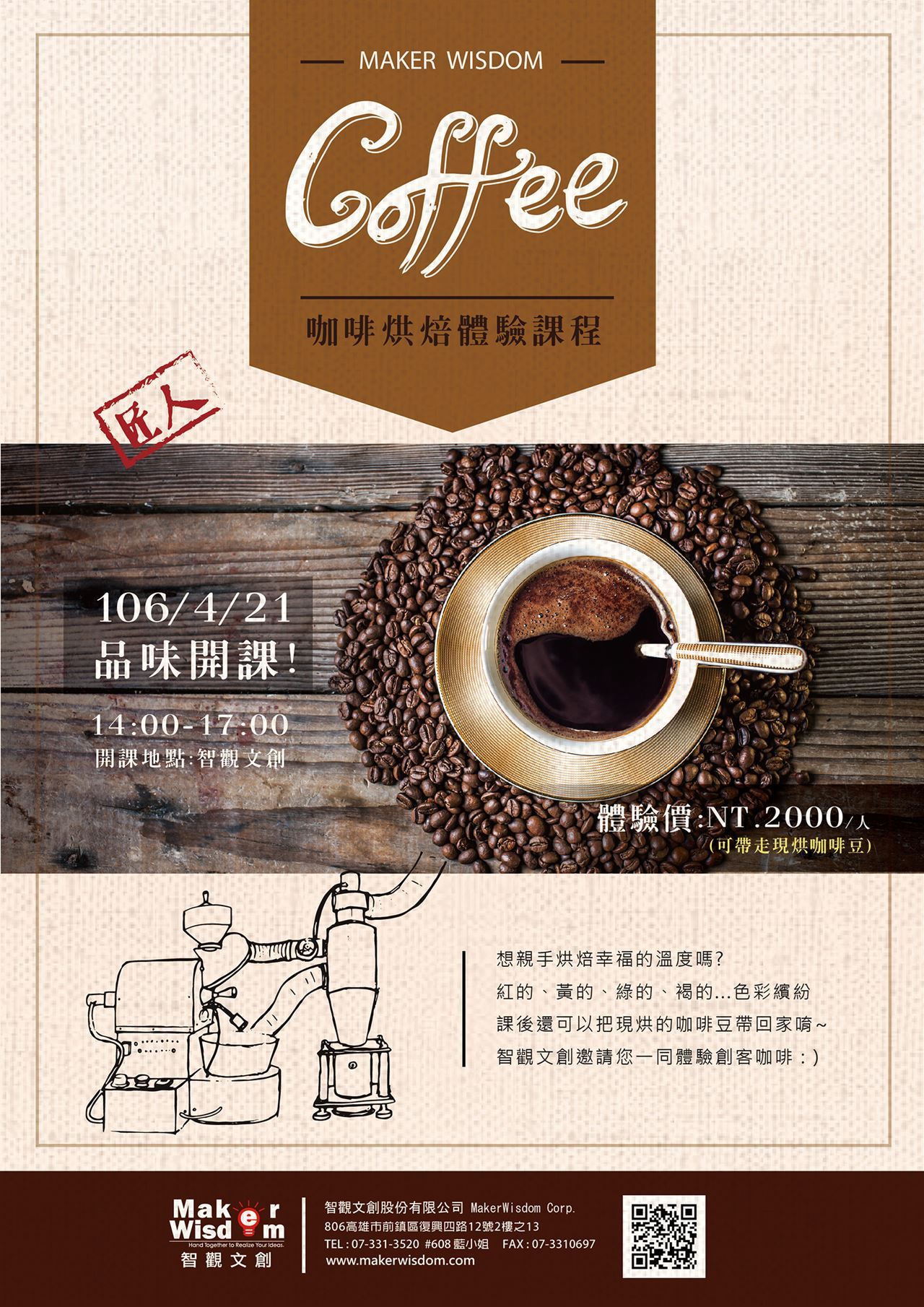 想親手烘焙幸福的溫度嗎?紅的、黃的、綠的、褐的...色彩繽紛課後還可以把現烘的咖啡豆帶回家唷~智觀文創邀請您一同體驗創客咖啡 : )體驗價 : NT 2000元 /人【匯款資訊:戶名 :智觀文創股份有限公司 合作金庫 高雄科技園區分行 3524-717-005201】