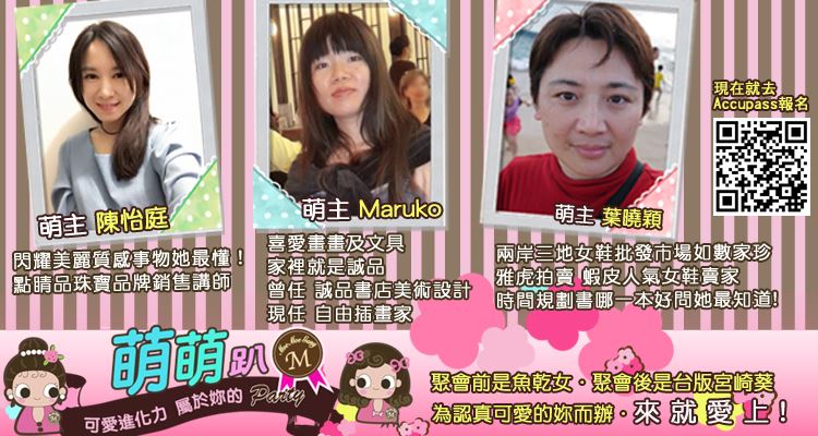 萌萌趴是專為可愛的女性設計的活動 ! 每一次的party都會有小課程、分享、音樂、甜點與佈置,讓您在優美愉悅的環境中,與您一樣喜愛可愛美好事物的女性,一起學習與分享,認識更多朋友,一起度過一個滿滿能量的下午!
