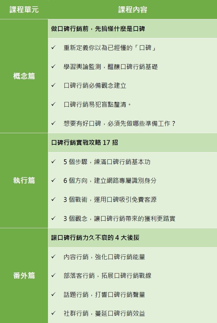 本次課程,行銷武士許小嚕,將全面解析口碑行銷的箇中三昧,從觀念重建、輿情監測、身分打造、到後援布局,一口氣為你建構兼具知名度和利潤的戰略思維,讓你從只能碰運氣的初心者,升級為發發好球的狂策士,從此擁有把品牌的好名聲藉眾人之口,遠遠拋往千萬里的神力!