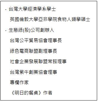 2008 年,一頭栽進國際公平貿易運動,創辦台灣第一家公平貿易認證商生態綠、持續倡議食物正義與倫理消費,並於 2010 年進一步到倫敦研究全球糧食產銷議題,並於 2015 年協助台灣經濟部中小企業處營運台灣第一個社會企業聚落,培育孵化社會企業。