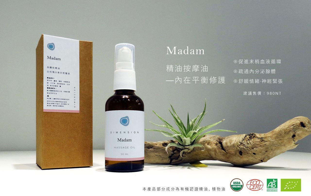 【好康】報名就送原價980元Madam頂級精油按摩油1瓶(50ml):含法國白玫、東印度檀香等10餘款天然植萃精油與有機植物油配方。
