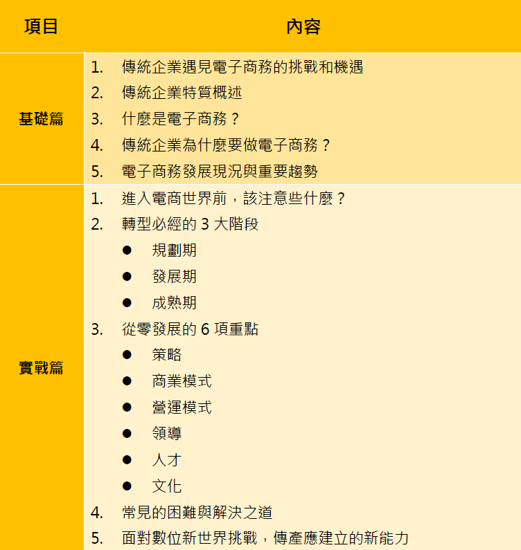 因此,當您發覺業績下滑,除了怨嘆政府或景氣,其實您還有更主動的選擇-進軍電商!您是否想知道,自己所在的產業,到底該用什麼模式,切進電商的戰場?而在正式進攻前,該做哪些準備?自己又該如何從零打造電商的實戰力?