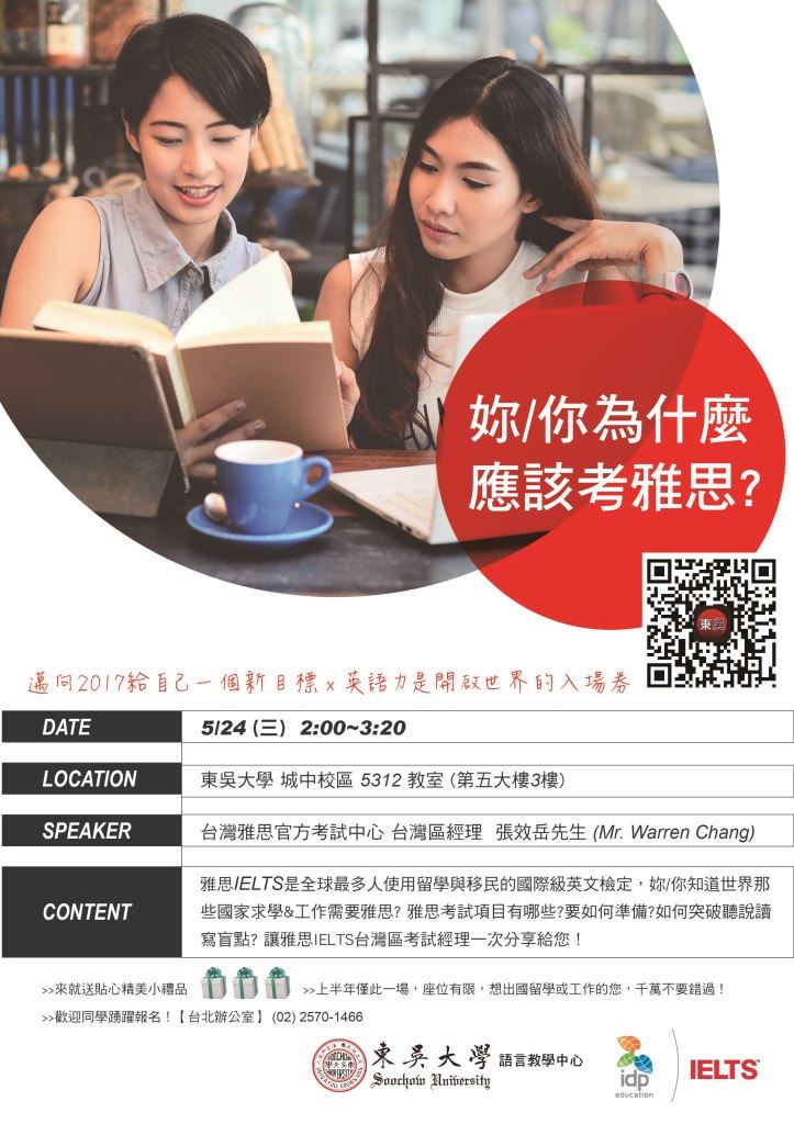 > 請先與東吳大學語言中心預約 聯絡電話:02-2311-1531#2652 簡老師