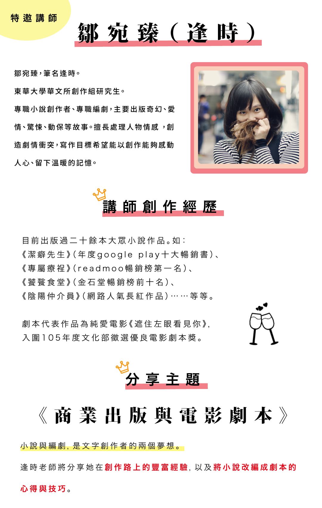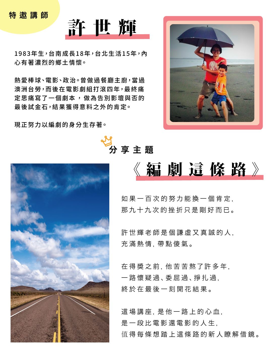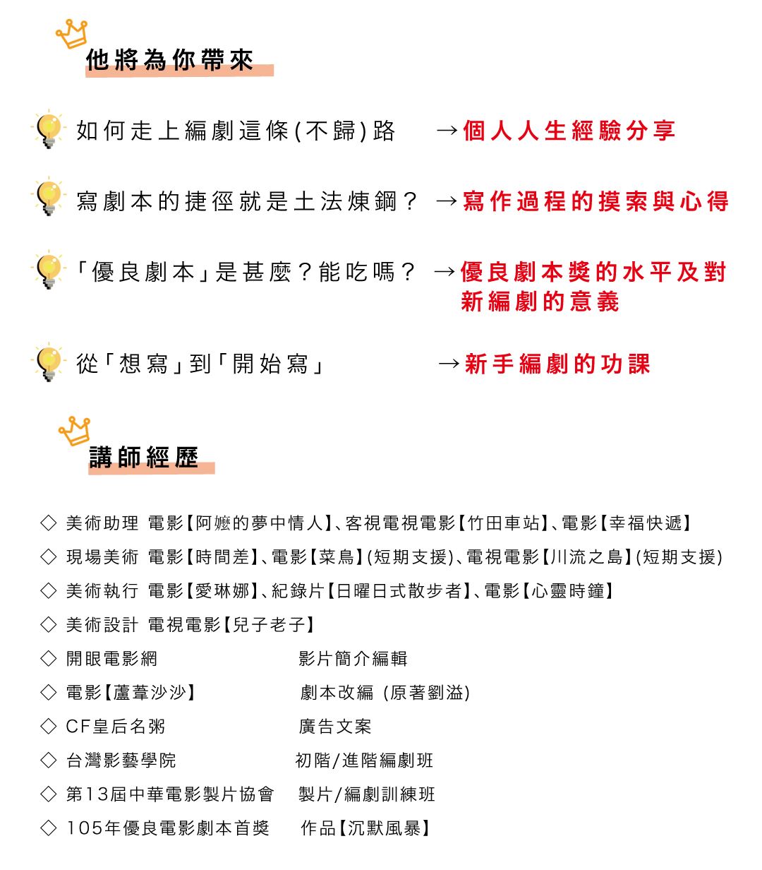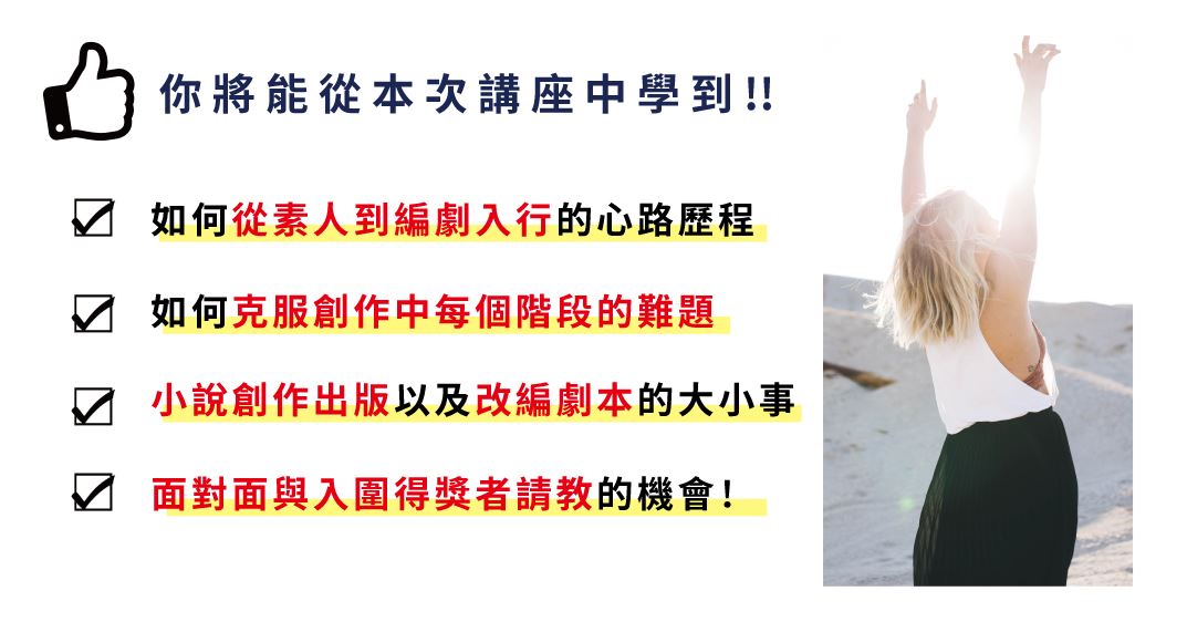 *註:本講座原名「創作路上的摸索、考驗與實踐」,因學員回饋原名過於抽象而更名為「編劇入行與小說出版」。