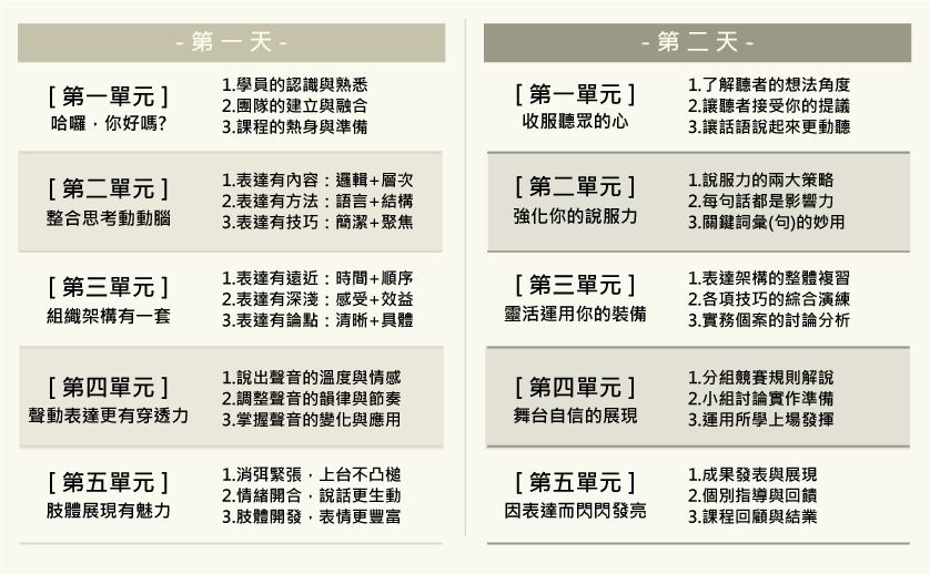 構。再來是聲音語調,不會單調平順,甚至教我們一些不同的發聲技巧。最後就是肢體動作,讓整個表達變得更生