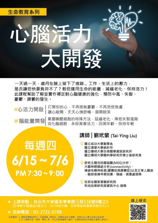本課程幫助您了解並實作禪定對心腦健康的強化, 預防中風,失智,憂鬱,躁鬱的發生。