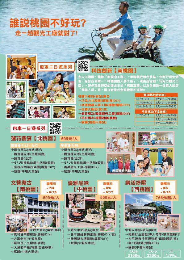 【親子微旅行包車遊】免開車、免計畫、小孩失心瘋,爸媽不累輕鬆GO 每個出發日期需滿20人成團,若未滿20人以上客服將會電話聯繫提供併團出發或退費,敬請注意*請參閱以上各條路線說明註1: 四歲以下同行者免費參加(但需繳交保險資料,行程內容不供餐、不佔位。) 註2: 南桃大溪線/北桃蓮花線/中桃楊梅線~大人小孩均同價。註3: 西桃新屋線有單車行程大人小孩設備不同,費用:4歲(含)~12歲以小孩計價,12歲(含)以上以大人計價。註4: 一日遊行程出發點皆從中壢火車站(後站)出口會合,將由領隊在現場集合。 註5: 報名完成付費後,將會收到email行程通知單,請於一周內回覆個人保險資料。 註6: 出發當天務必準時抵達集合地點,並保持聯絡手機暢通,以免行程延誤。