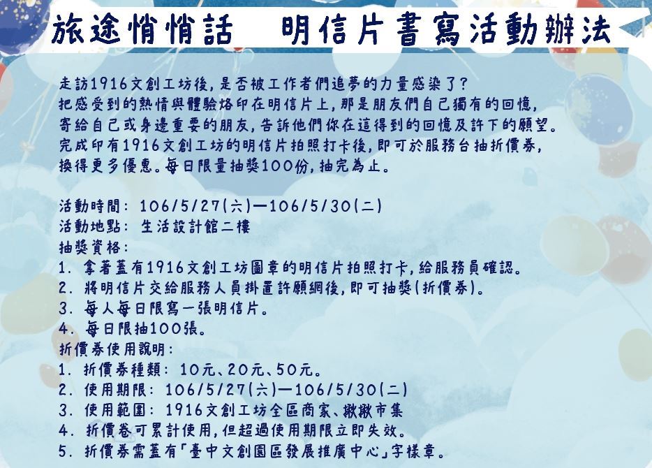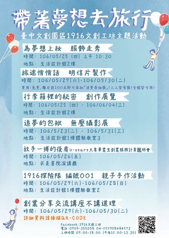 「帶著夢想去旅行」主題用:為夢想上妝(走秀)、行李箱裡的秘密(展覽)、追夢的包袱(攝影展)、放手一搏的後盾(U-star大專畢業生創業服務計畫說明會)、1916探險隊(兒童手作營)、旅途悄悄話(書寫明信片)、創業分享交流講座不講道理(講座、表演)等串連活動帶出工作者們在創作一途上的歡笑血淚。