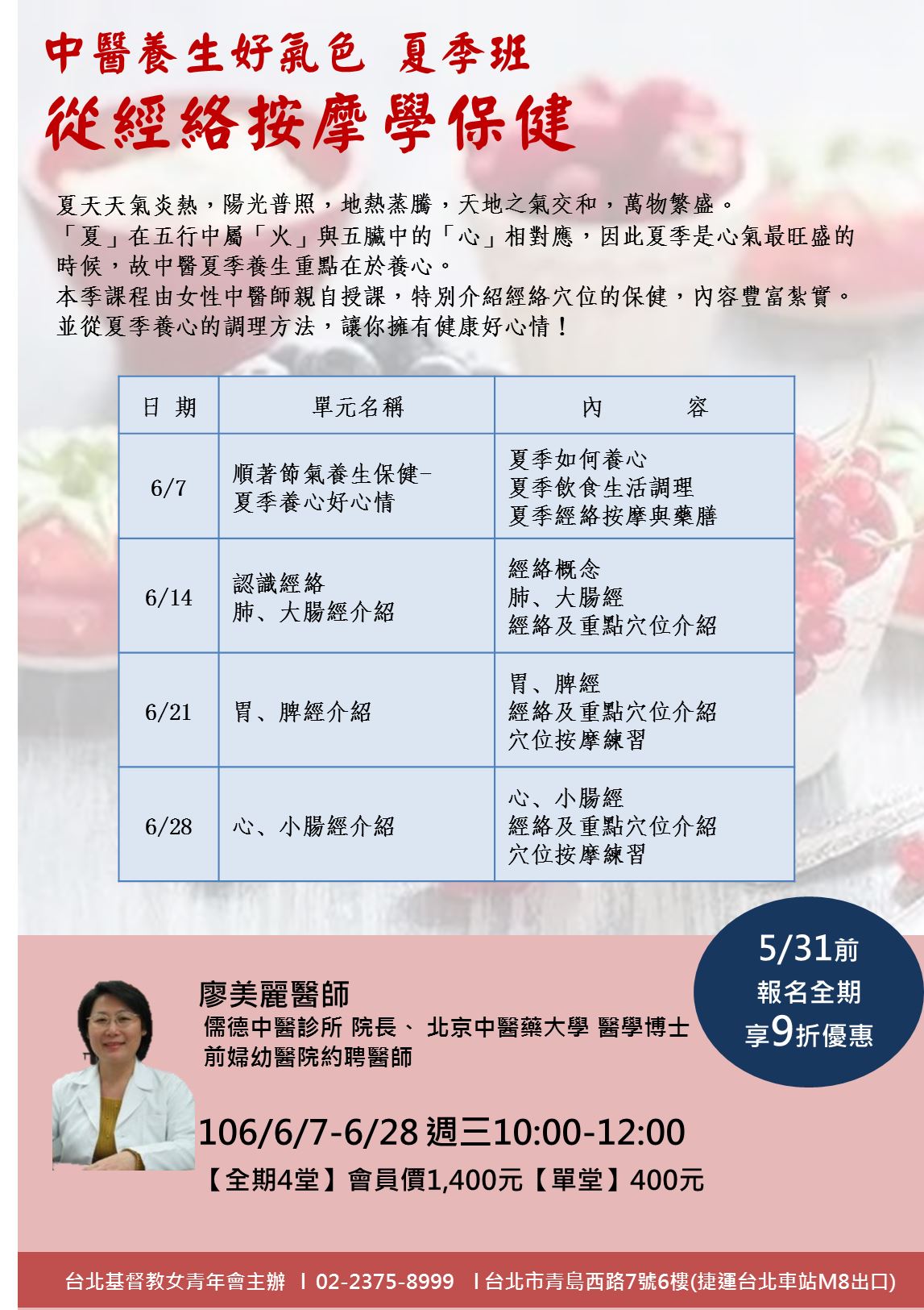 線上報名 :http://www.ywca-taipei.org.tw/edu/lift155.htm台北基督教女青年會台北市中正區青島西路7號(捷運台北車站M8出口)報名專線:02-2375-8999