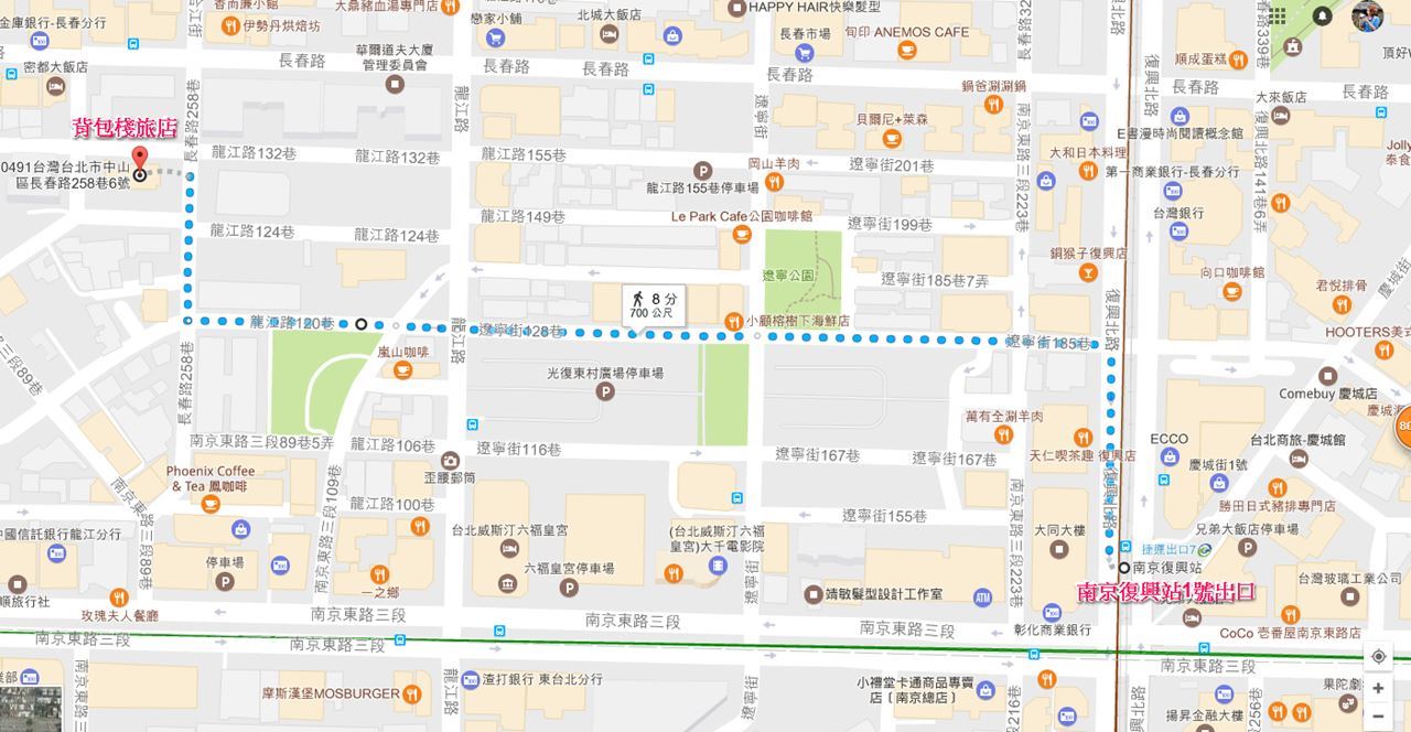 背包棧旅店:台北市中山區長春路258巷6號2F(南京復興捷運站1號出口)