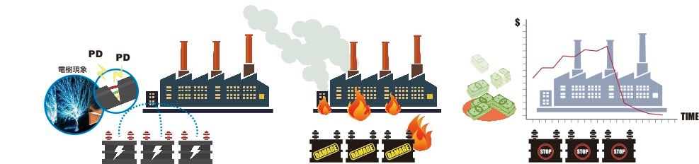 電氣事故可能發生局部放電是中壓(0.6kV-25kV)、高壓(>25kV)電力設備:變壓器、配電盤、電力電纜、GIS…等;由於局部放電的持續性發生,將恐會造成廠家人員生命安全與威脅、縮短電氣設備使用壽命、嚴重的經濟損失、...不容忽視!