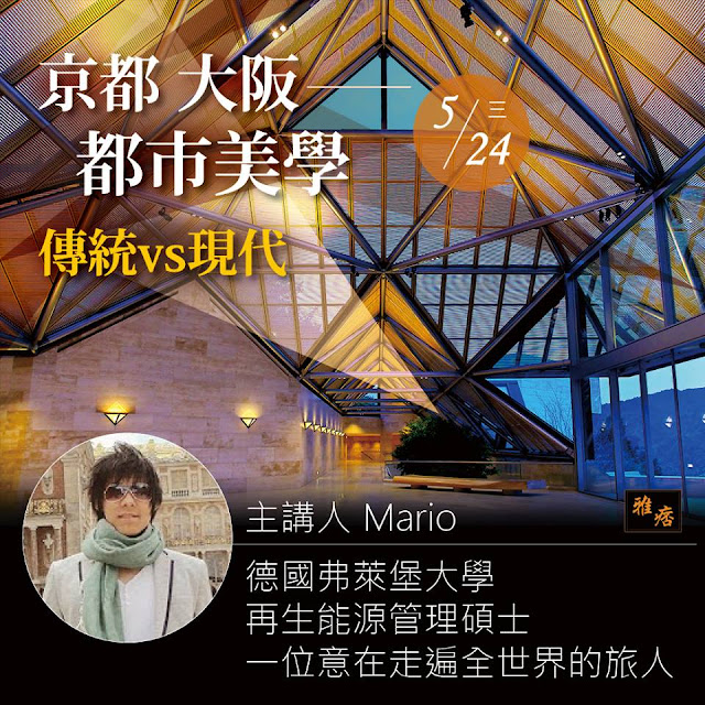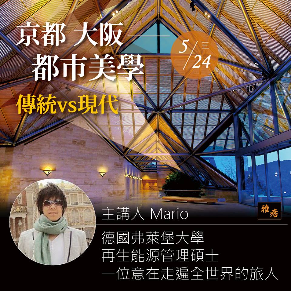 大阪一直被視為活潑的現代化城市,不遠之處的京都則為千年古都,時光彷彿被定格在輝煌過去,一切都在傳統中打轉,然而,風格迥異的兩座名城在後人耕耘下,建築美學不斷跟隨年代演進,安藤忠雄、貝聿銘等世界級建築大師皆在此地留下精彩作品,安藤忠雄更是把建築師事務所設在大阪,帶頭革新日本建築形式,反觀京都,雖然古屋居多,但在歷史綜合悠閒氛圍下,卻能創造出不少獨特空間,這次講座帶來大阪與京都的獨特都市美學,體驗傳統中見創新的魅力。
