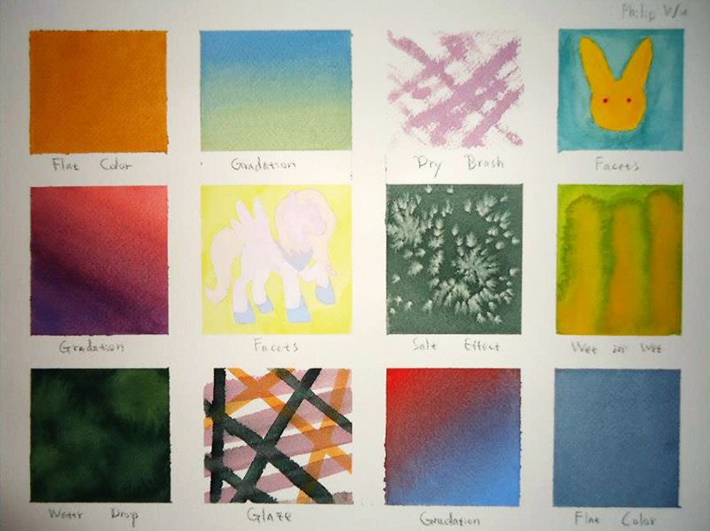 -自由地嘗試多種不同的媒材與水彩共同應用,包括水粉、色鉛筆、蠟筆;酒精、鹽巴、茶等