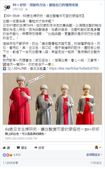 一個人看來是否年輕、有型?髮型佔了最大的因素。「50+」日前報導日本61歲主婦Tomi「如何讓白髮變可愛」的穿搭術,超過萬人分享轉貼,獲得熱烈迴響,許多讀者來訊詢問希望能上有關白髮造型的課程。