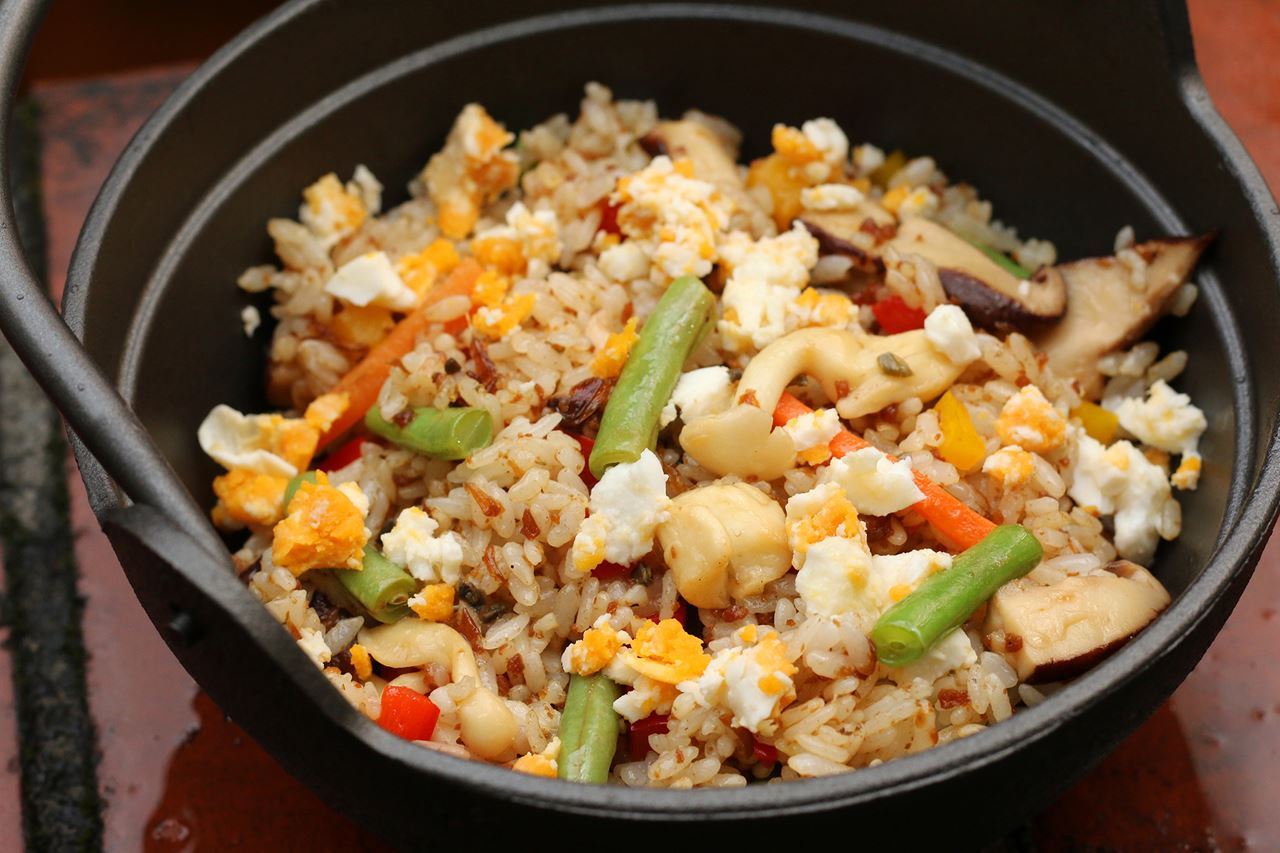 空間本身為復興台灣好米基地,提供輕食米料理及米商品。香腸及洋蔥先爆香,加入古早紅蔥醬,拌入台灣精選好米。