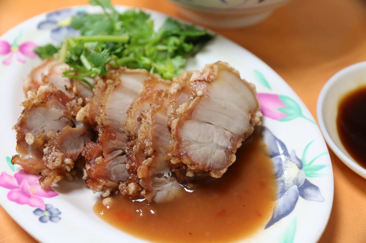 安西街80年在地好滋味,傳承三代,人氣排隊料理,紅燒肉將三層肉醃過紅糟之後,再炸得酥脆。白斬雞採用放山土雞,肉質緊實,外皮油亮,肉汁鮮美。