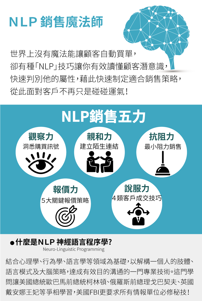 「NLP 銷售魔法師: 潛意識銷售」,不同於激勵吶喊式的心理提昇課程,我們將結合NLP神經語言程序學的觀察力與溝通方法核心,配合實戰的銷售策略與分析,提供給你來規劃一套屬於自己或團隊的銷售戰場的作戰兵法。