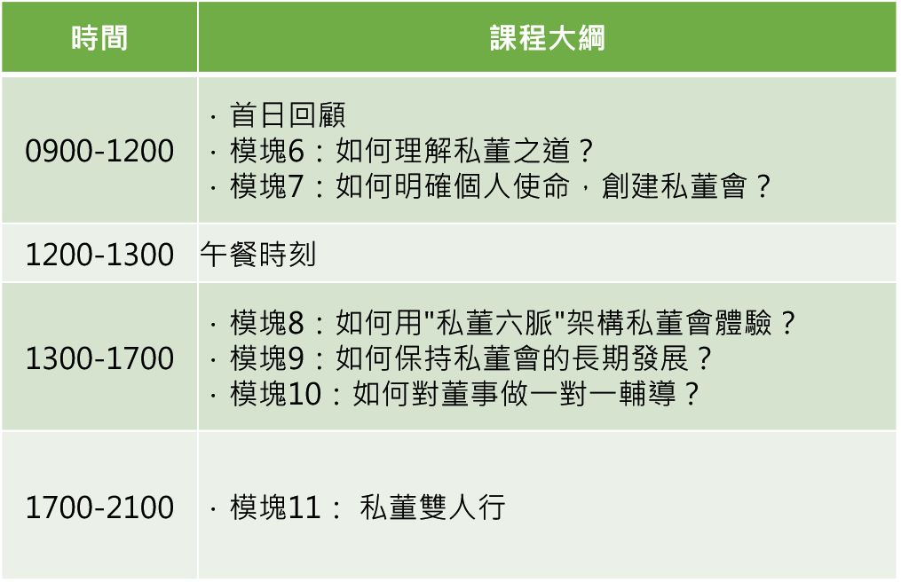 - 參加【私董研習營】的專業培訓是下一步請專業私董認證的必備條件,私董行業必定會全面走向專業化發展道路,未經培訓的私董難以獲得客戶認可