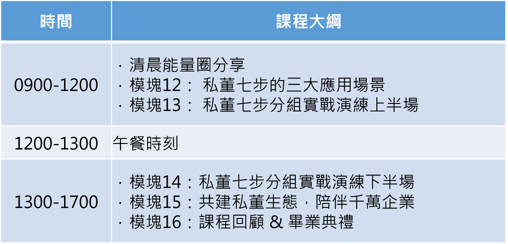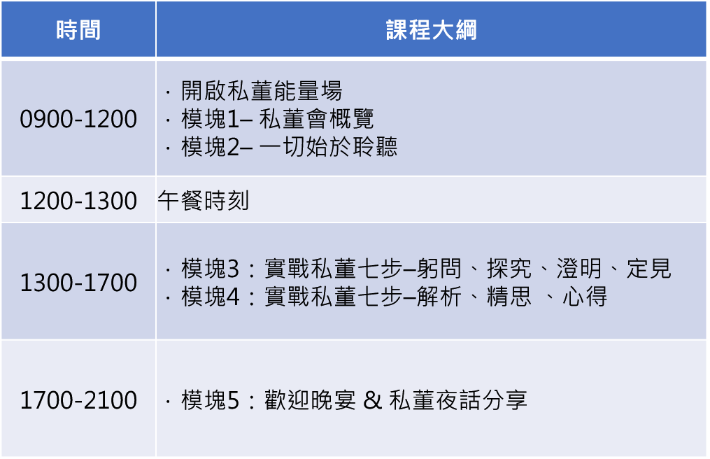 - 三天二夜集中研習,便於您迅速掌握「私董」的技能和方法