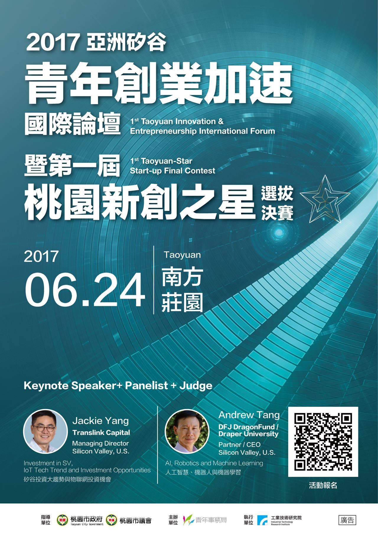 今年邀請矽谷創投界重量級人物 Jackie Yang(Translink Capital)與 Andrew Tang(DFJ Dragon Fund/Draper University)來桃園進行主題演講,並擔任圓桌論壇與談人與桃園新創之星選拔決賽評審,與現場觀眾進行交流,期待一下,他們可都是揣著沉甸甸的寶藏哦!