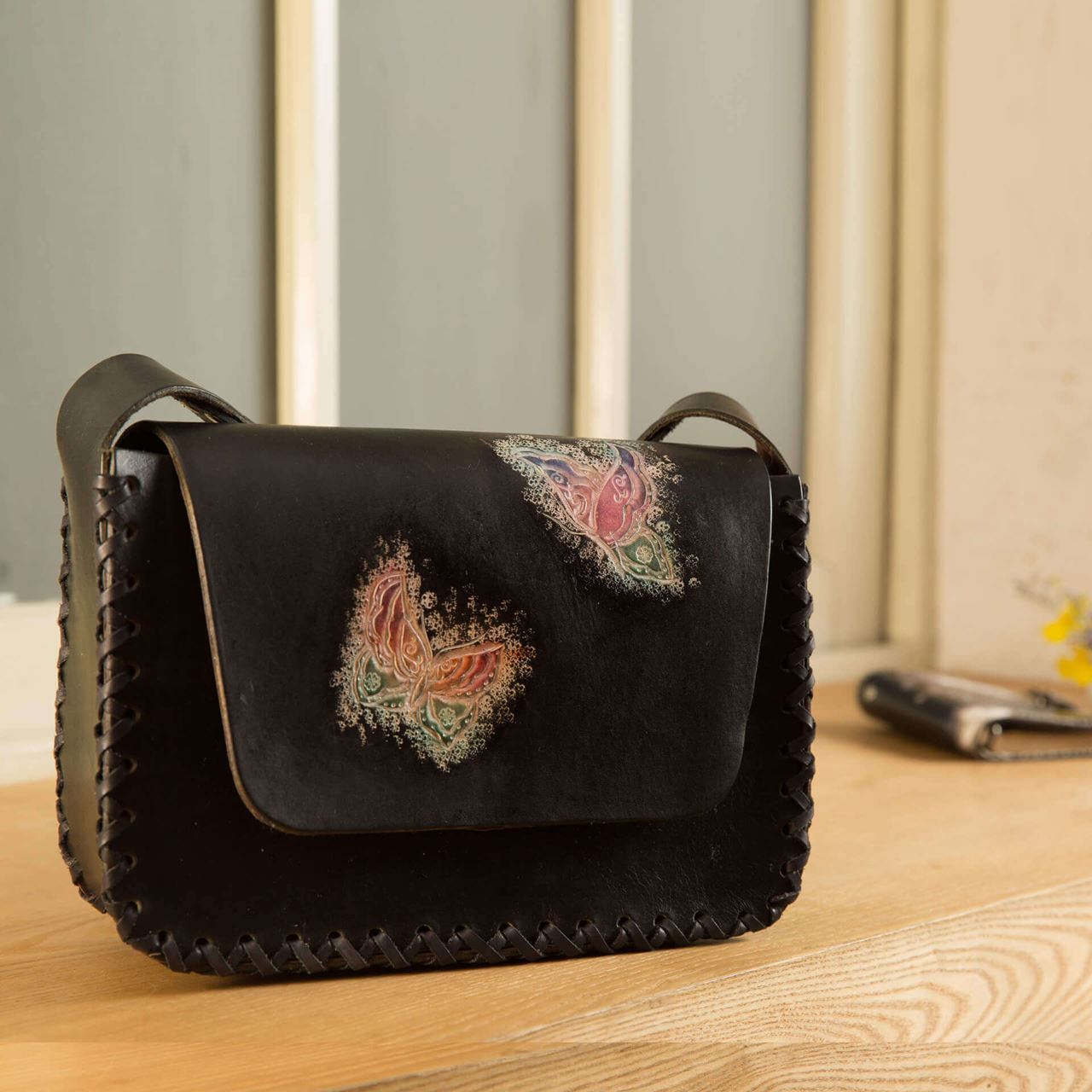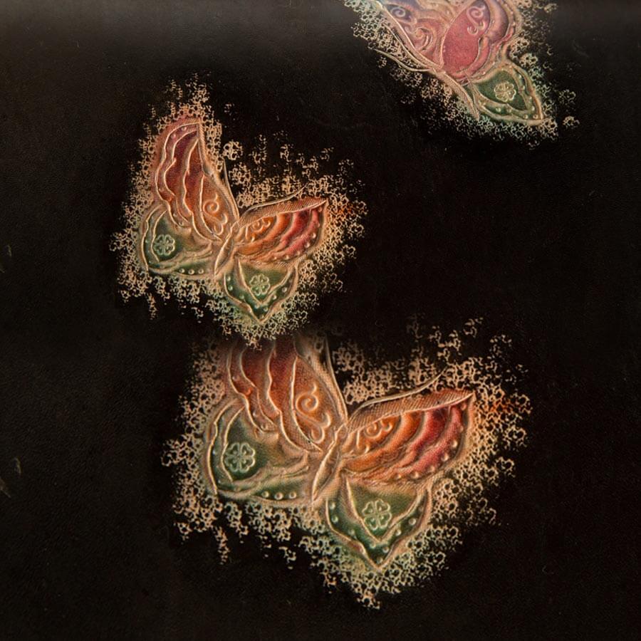 另外,「桐花飛雪」系列產品以行書字體呈現行雲流水之飄逸美感,搭配大小不等浮雕桐花及雲紋圖形,以皮革手工製作出托盤及壁飾兩用之生活藝品。同系列產品還有手提包、記事本,製作上先以鐵筆將圖案描繪在質地細膩的牛皮上,以刻刀雕刻捶打出立體感,再使用壓擦手法呈現浮雕感,經由重複染色展現出桐花及雲紋美感,是洋溢客家風情的精緻創作。