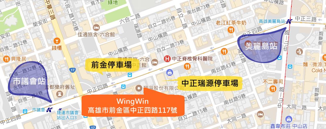 - 位置:高雄市前金區中正四路117號(WingWin,翔溢股份有限公司)