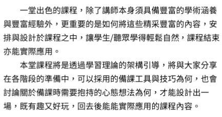 透過理論與軟體工具,回到授課的初 心,討論與分享備課最重要的心態想 法,期望透過交流,能豐厚彼此的教學 信念。