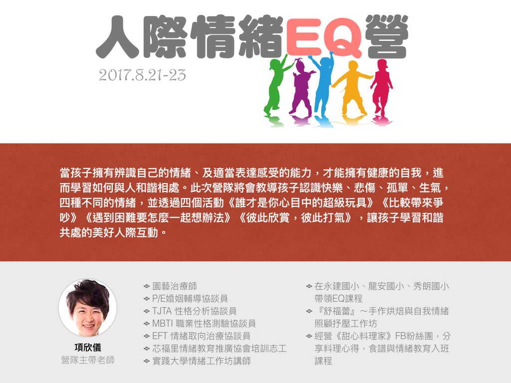 營隊費用:每人2400元(含三天午餐)活動日期:2017.8.21-23