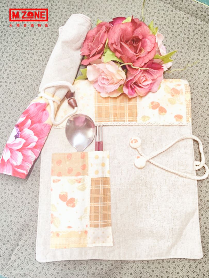 以直線車縫為主,加上隔間設計,讓外出用餐的筷子、湯匙都能有自己的位置。環保餐具袋可以自行設計成全家人使用的大小,也能夠單獨一人使用的尺寸。亦可當成餐墊使用,非常實用的日常小物。也是出外用餐時的小確幸。