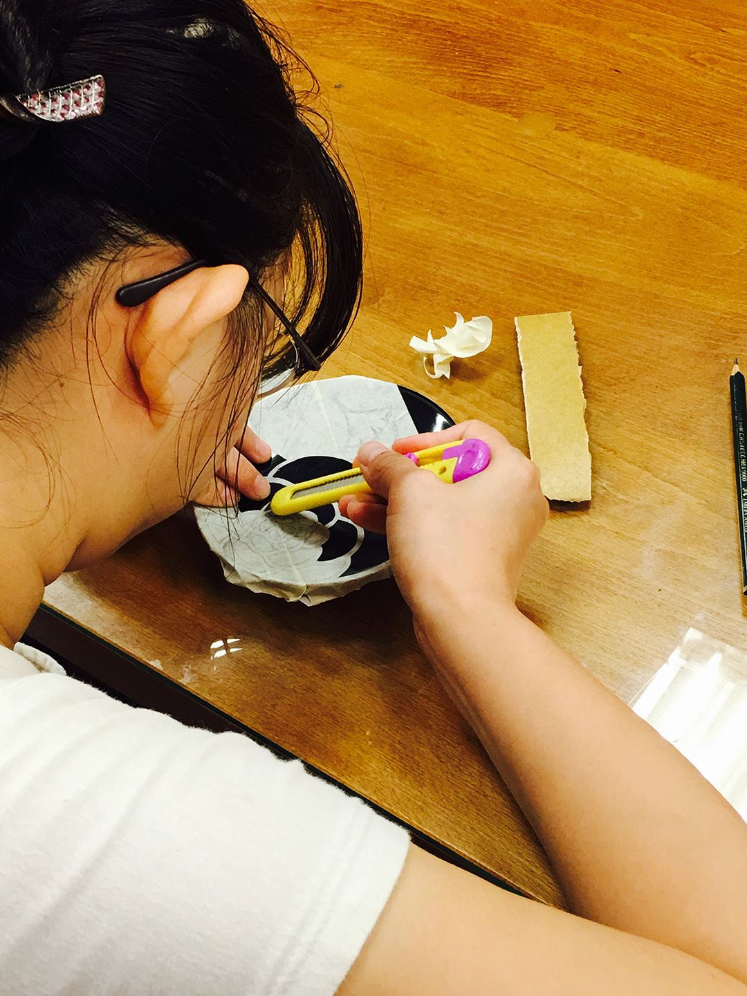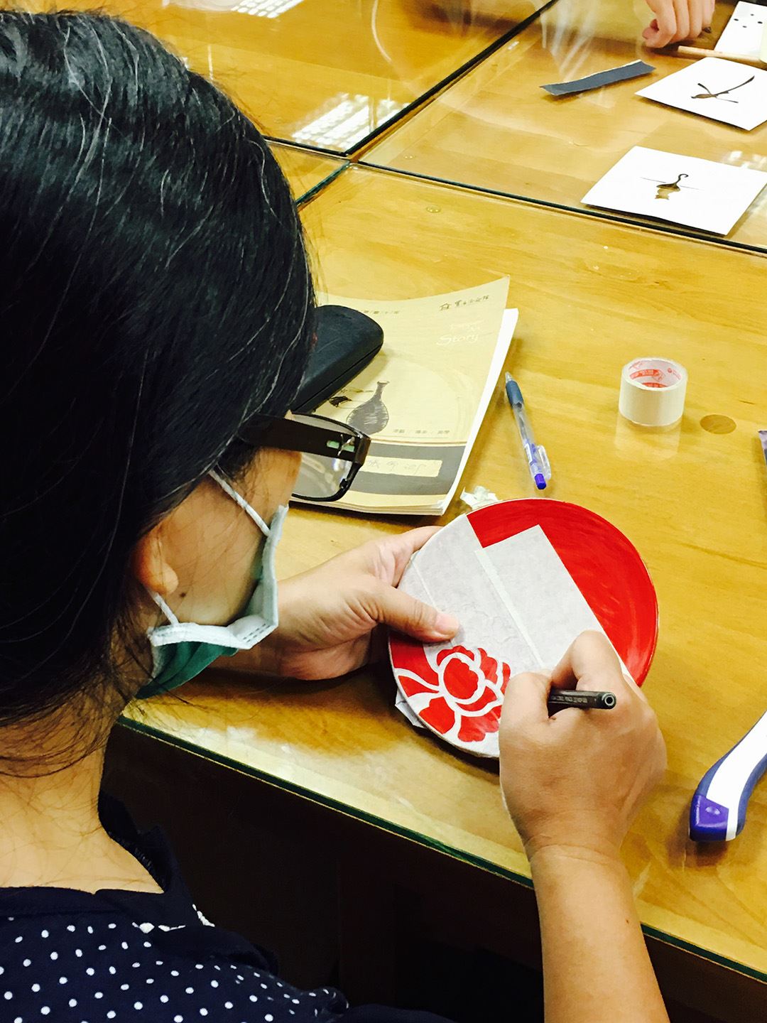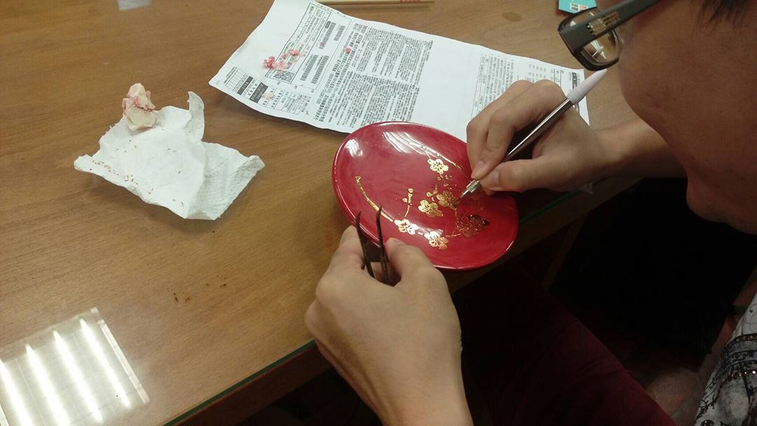 本次課程的成品為漆盤,是使用<金箔貼附>的技法製作,漆工藝的技法五花八門、炫彩奪目,而金箔貼附在漆工藝中算是較為簡易、好操作的。利用簡單的構圖配置,設計出剪影的圖面,做出黑金強烈的對比,學員可自行選擇喜歡的圖稿製作。先將漆盤貼滿和紙膠帶做為防護,以筆刀沿著圖稿切割;再以樹漆當作黏著劑,將金箔平整貼附在漆盤上,最後將和紙膠帶撕除,塗上金箔保護劑以防止金箔脫落,即可完成華麗又炫目的金箔漆盤。