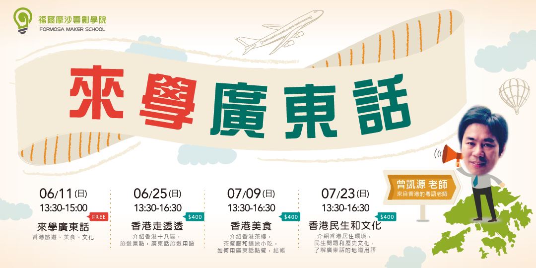 歡迎加入我們的行列癌一起學習並探討香港文化與廣東話的日常用語。7月23日 13:30-16:30我們將介紹香港居住環境、民生問題和歷史文化、了解廣東話的地道用語...電話:04-22232385 小瑋老師 信箱:edu@formore-maker.com台中市中區中山路33號4F (福爾摩沙雲創學院)400元/人