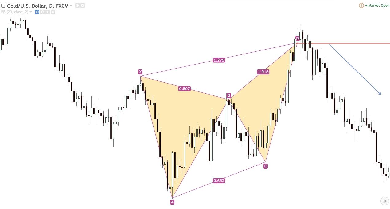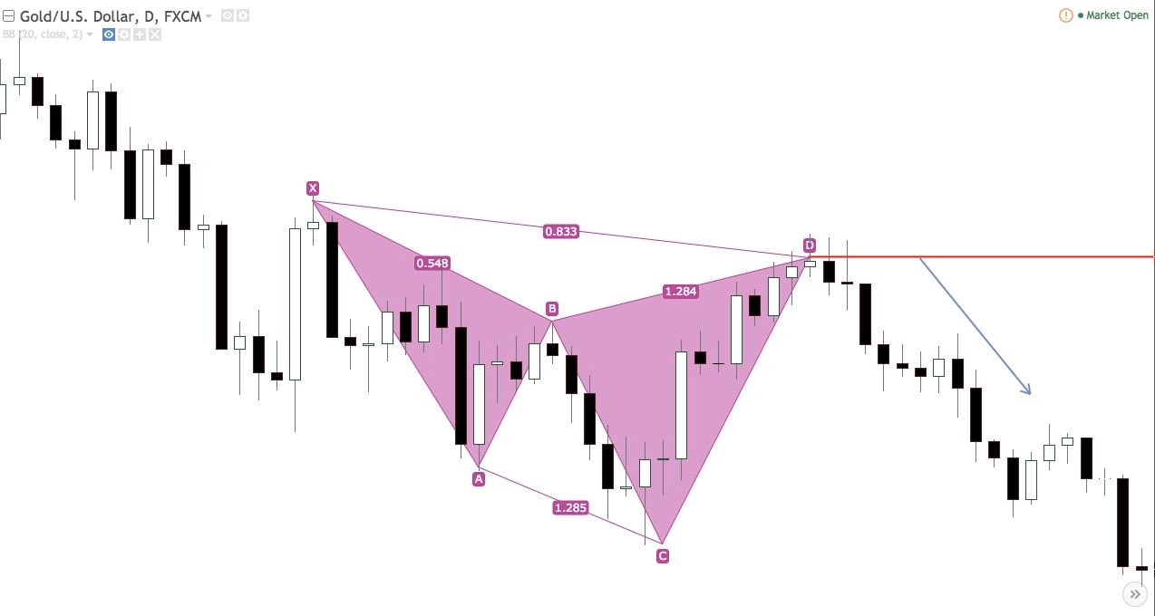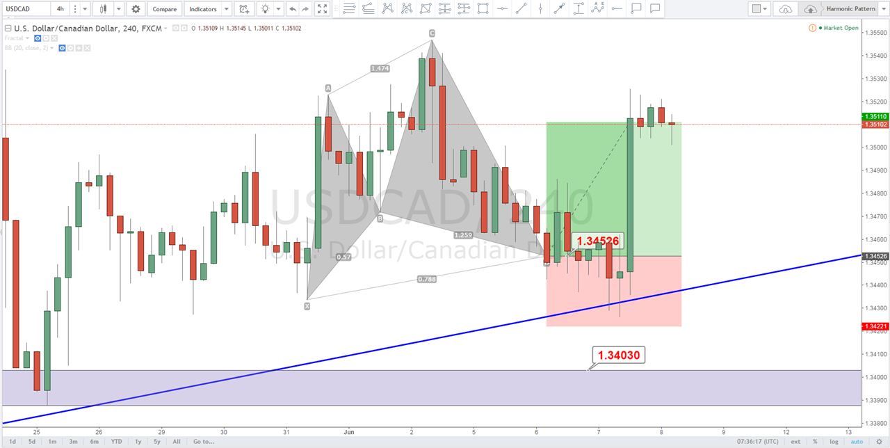 在美元兌加元四小時圖中,一段緩慢下行的趨勢,透過諧波交易裡的“加特利型態”,