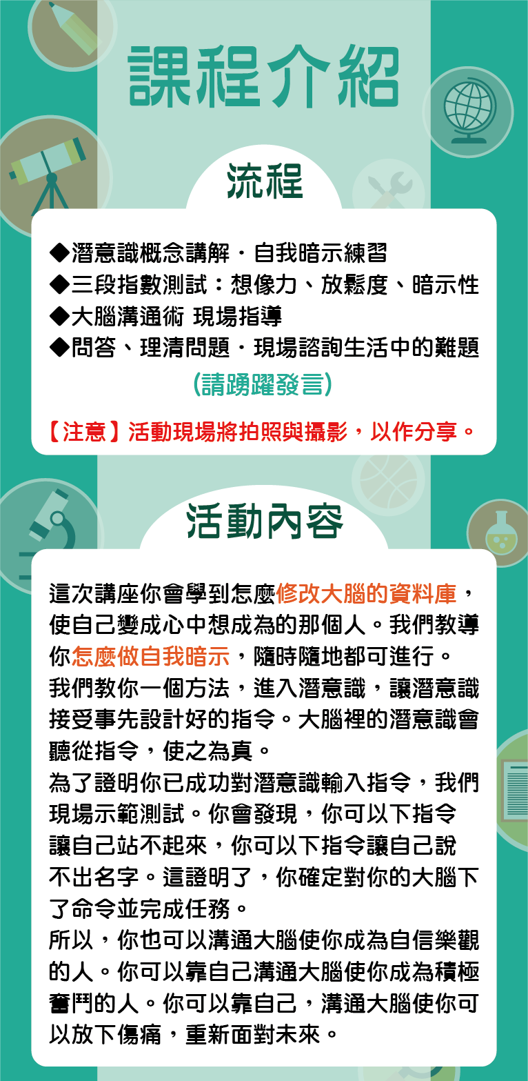 上課人數:因場地限制及維持講座品質,場地只能容下人數 80位。