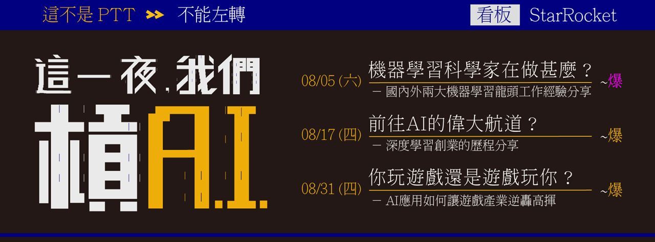 身為一個玩家的你,厭倦了一成不變的遊戲模式嗎?作為一個遊戲開發者,想知道更多開發的可能性嗎?在遊戲中,A.I.如同一隻看不見的手,執導著玩家的操作,更是開發者提升遊戲體驗的助手。這一夜,將由遊戲A.I.研究無人不知無人不曉的戴文凱教授,以及致力於A.I.技術導入遊戲中的創動遊戲Alex和大家聊聊,同時我們也準備了超長的Q&A時間和最無距離感的空間,讓大家一手拿啤酒、一邊逆~轟~高~揮~