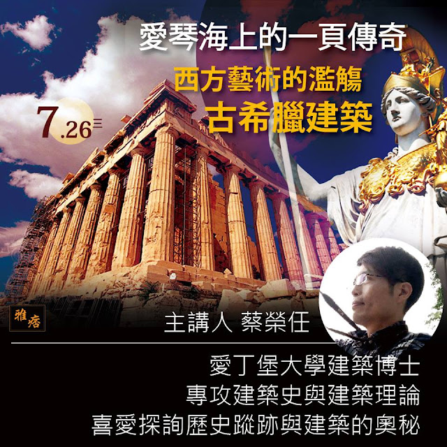 除了帕德嫩神殿,古希臘建築的遺跡裡還有遼闊的奧林匹克體育場、神聖的阿波羅聖域、典雅的安哥拉市集、以及一座座數不盡的雄偉神殿。本次講座將帶領聽眾重回古希臘,領略愛琴海上的建築之美。
