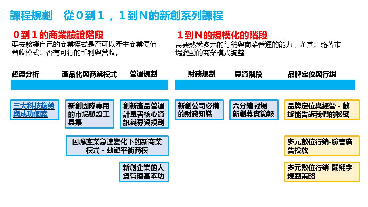 這是最完整的新創系列課程,課程不僅包含從新創團隊的最初構想階段到擴張階段所需要的知識和技巧,也橫跨不同經營面向,包括法務、財務、行銷、管理與品牌定位等專業。
