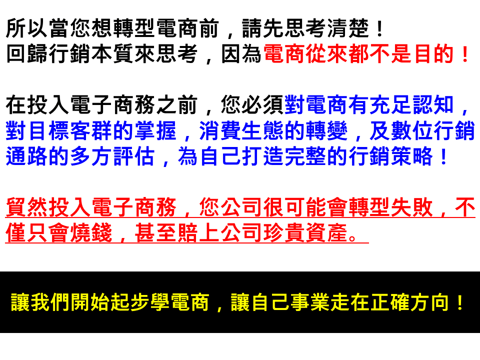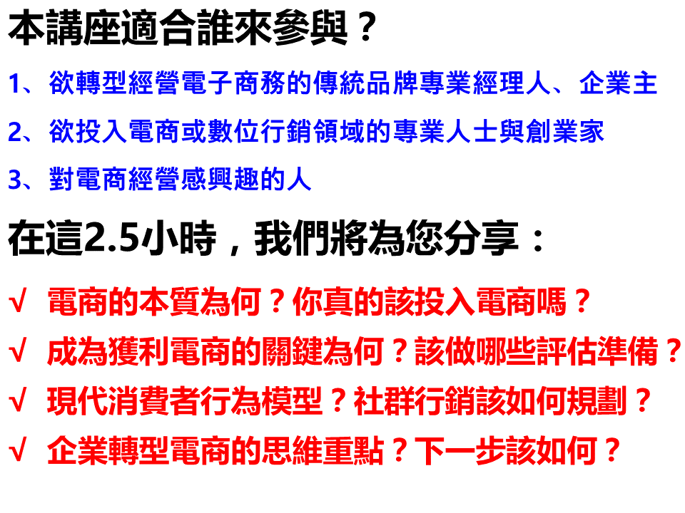 1、欲轉型經營電子商務的傳統品牌專業經理人、企業主
