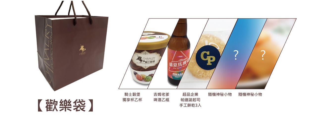 可兌換歡樂袋(內含Jim&Dad啤酒乙支、騎士穀堡爆米花獨享杯.......等神秘優質商品。)