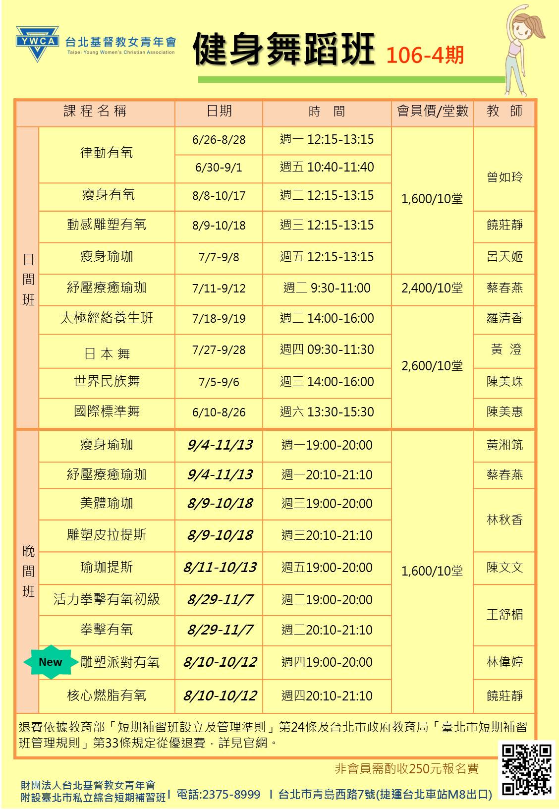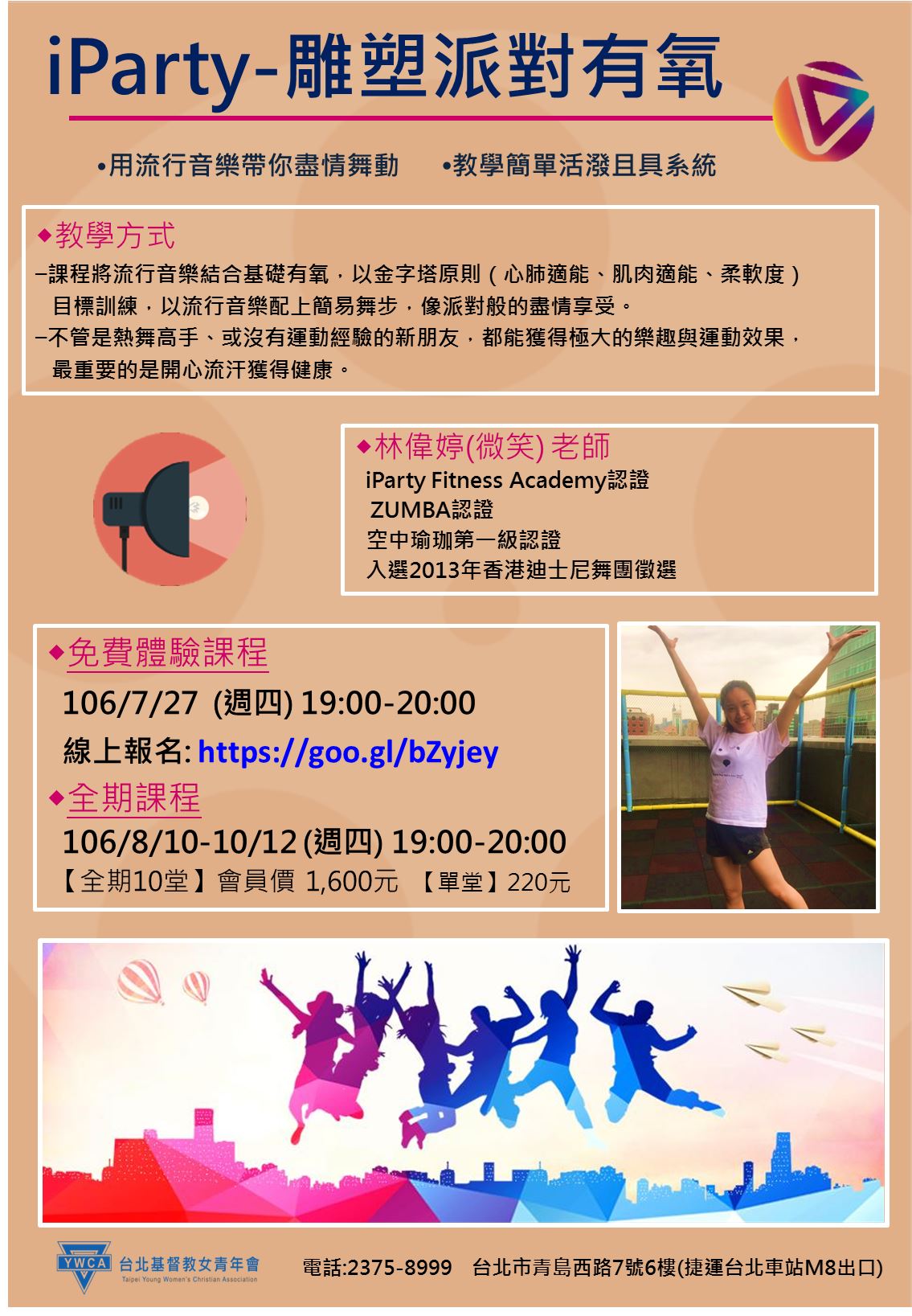 歡迎長期久坐辦公室的上班族來動動身子,也歡迎喜愛有氧律動的你來展現熱情活力~106/8/10~106/10/12 週四19:00-20:00【全期10堂】會員價 1,600元 【單堂】220元線上報名:http://www.ywca-taipei.org.tw/edu/p5_dance76.htm上課地點:女青大樓◆木質地板,93坪寬敞空間,提供完善舞蹈及瑜珈教學練習環境。 ◆空調設備,調節教室溫度。台北基督教女青年會(捷運台北車站M8出口)台北市中正區青島西路7號報名專線:02-2375-8999