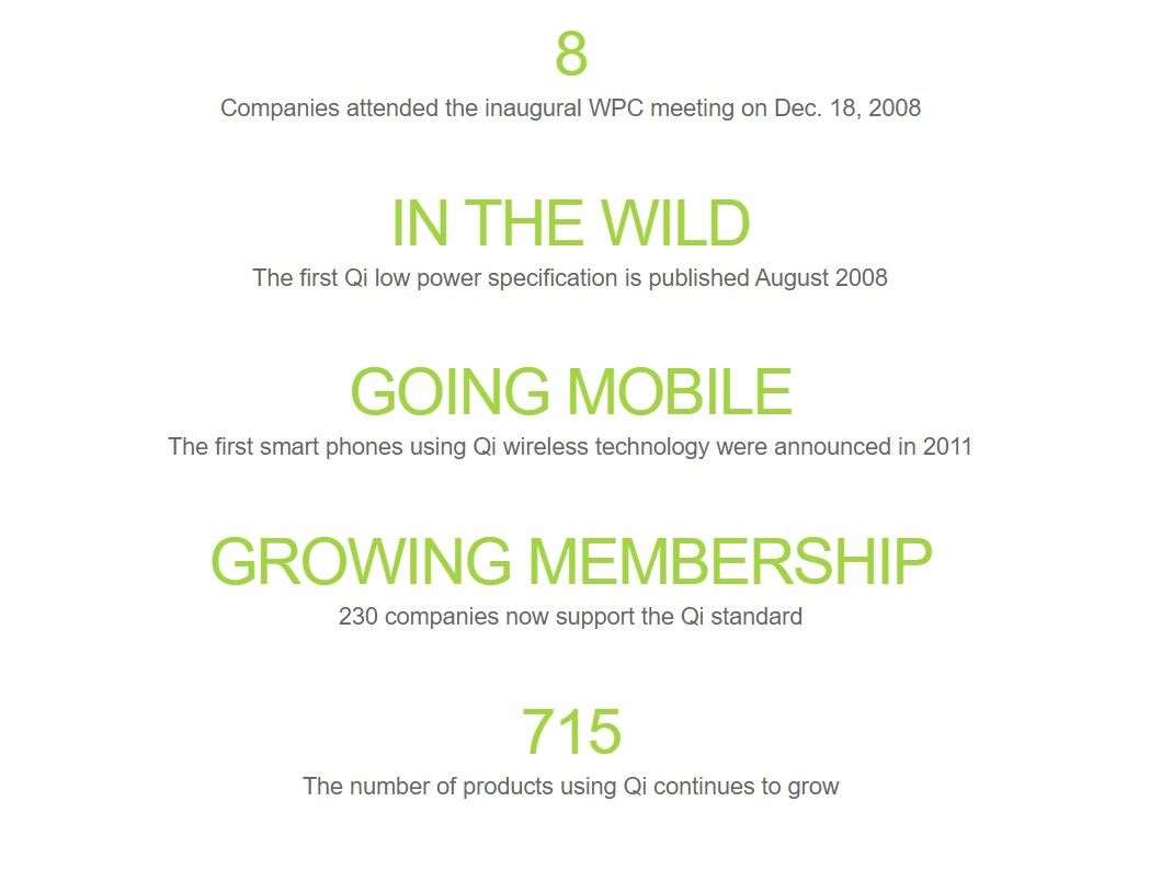 WPC無線充電聯盟於2008年12月17日由,ConvenientPower Limited、Fulton Innovation LLC、羅技公司、美國國家半導體公司、奧林巴斯株式會社、荷蘭皇家飛利浦電子公司、三洋電機株式會社、深圳桑菲消費通訊有限公司及德州儀器公司(依英文字母序)共9家公司創立,以制定所有電子裝置都能相容的無線低功率充電國際標準為使命,WPC 是目前最大的無線充電聯盟,會員數量超過 230 家其中包括諾基亞、HTC、三星、蘋果等,它在 2010 年製定公布的 Qi 規格是目前應用範圍最廣的無線充電標準,支援的產品超過 1,300 餘種