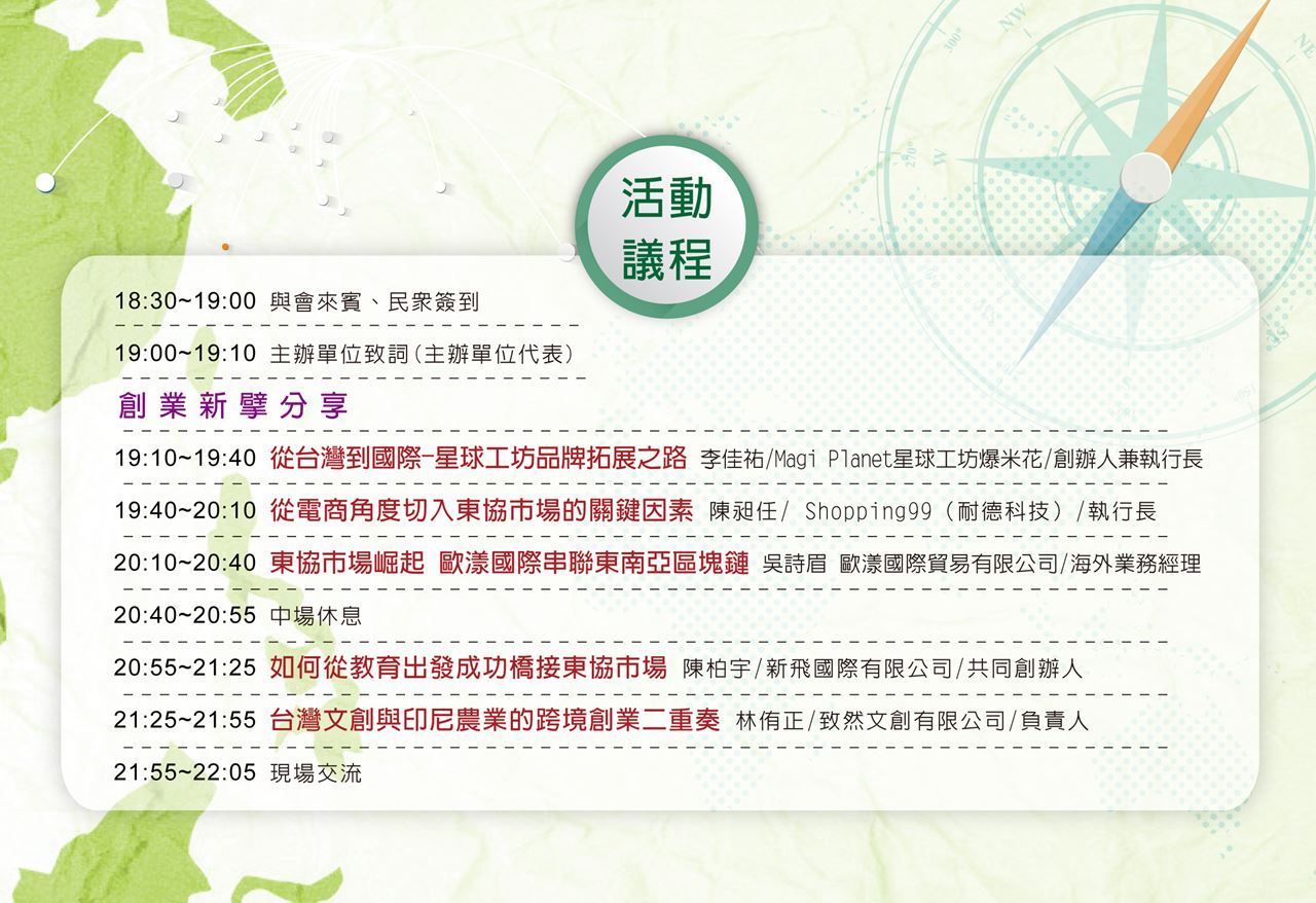 本次的創業聚會力邀來自文創、教育、電商等不同領域的先進齊聚一堂,共同分享前進東協創業的經驗,剖析東南亞市場,分享南向的經營與挑戰,跨境經營有哪些重點需要掌握,面對不斷求新求變的國際趨勢,業者該如何乘勢而起。透過活動的彼此交流,提供有意前往南向發展的新創團隊一個創業指南針。攜手立足台灣,跨足國際,創造無限可能!